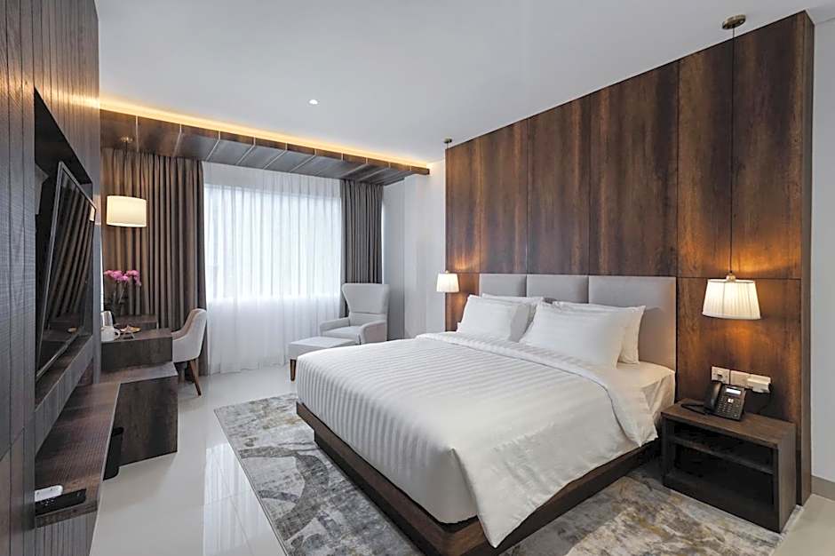 On-site dining is led by Restoran #1, offering a Modern ambiance with American cuisine. Payment options are cash only. Room options include Deluxe Double Room, Executive Twin, Executive Balcony, Deluxe Executive, and King Room with Mountain View, providing a range of choices for couples and families alike.